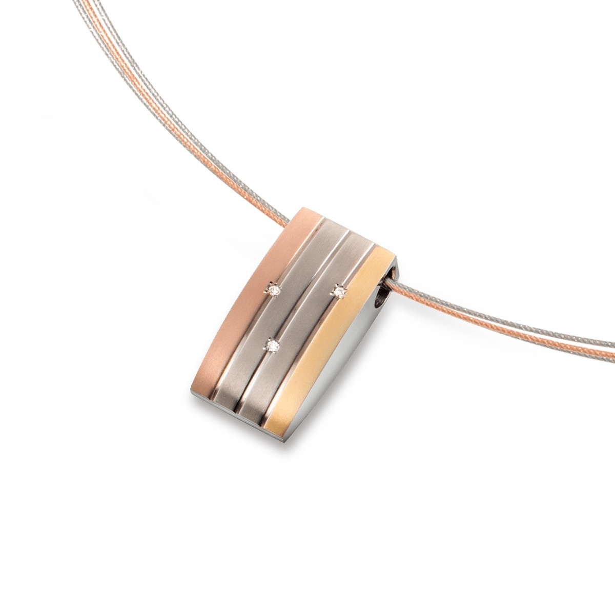 Artikelbezeichnung Anhänger MehrsteinerLegierung Titan tricolorBesatz DiamantAnzahl Diamanten 3Diamantgewicht 0,015 ctDiamantqualität W siStärke 6