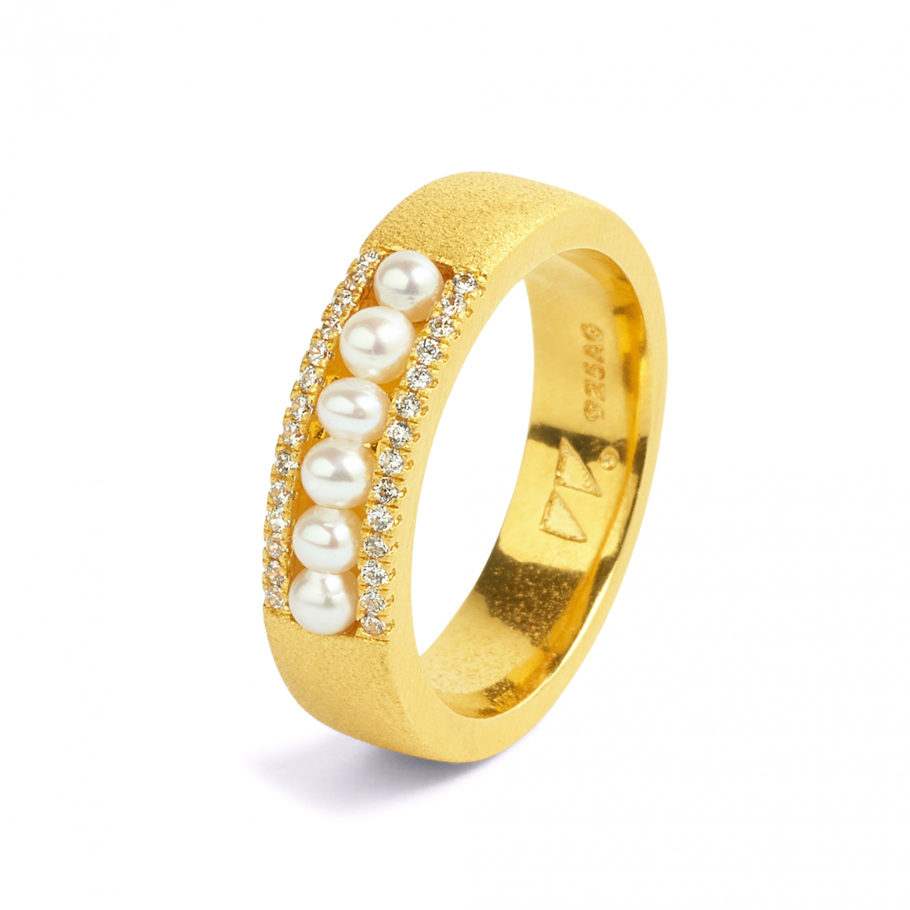 Damenring Mehrsteiner, 925 AG gelb vergoldet, Süßwasser Zuchtperle Zirkonia,