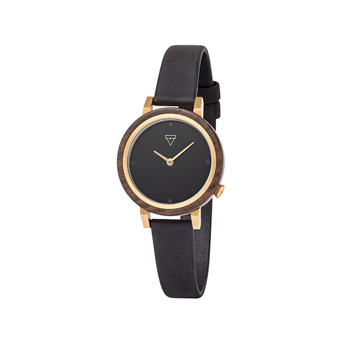 Luise Sandelwood Midnight black, Damenuhr analog, Edelstahl/Holz, Lederband, 3, Quarzwerk, Rund, Mineralglas, Symbole, 8,