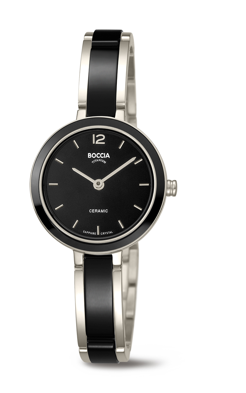 Damenuhr analog, Titan Cer, Keramik, Gliederband, 5, Quarzwerk, Rund, Saphirglas, Arabisch+Symbole, 6,5,