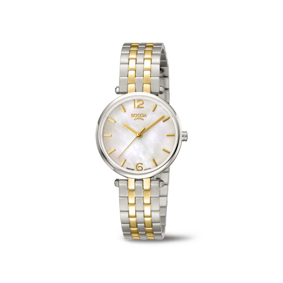 Damenuhr analog, Titan Bicolor, Gliederband, 5, Quarzwerk, Rund, Saphirglas, Arabisch+Symbole,