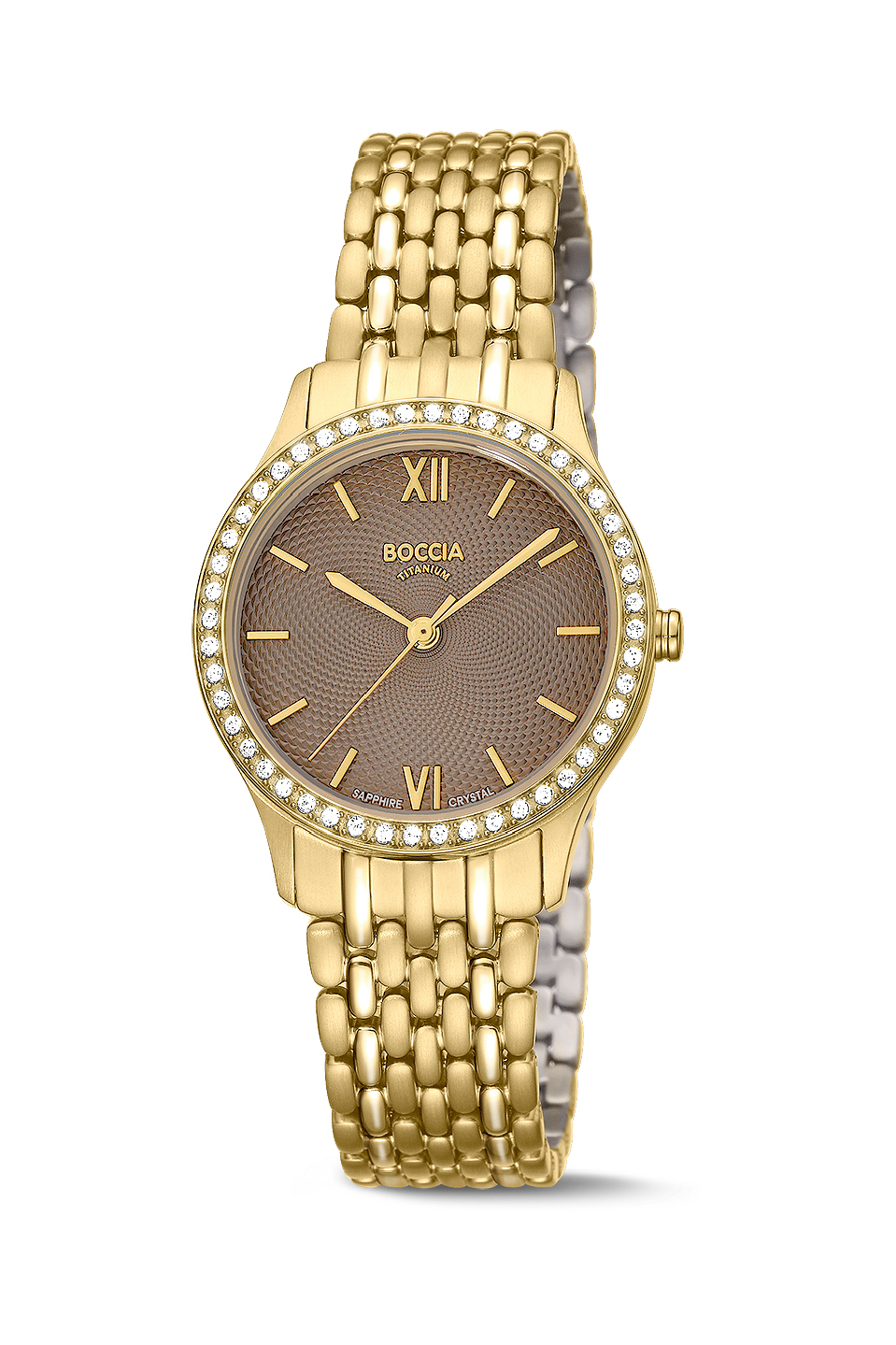 Damenuhr analog, Titan gelb, Simili, Gliederband, 5, Quarzwerk, Rund, Saphirglas, Römisch+Symbole, 6,8,
